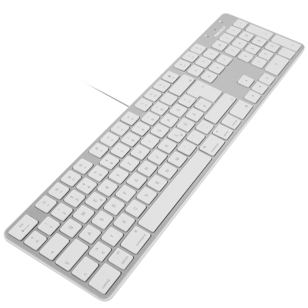 Die Macally SLIMKEYPROA flache Tastatur verfügt über eine Standardanordnung mit 104 normalgroßen, aber flachen Tasten, die ein komfortables und effizientes Tippen ermöglichen. Die zusätzlichen Kurztasten und die Zehnertastatur ermöglichen eine weitere Steigerung von Effizienz und Produktivität.